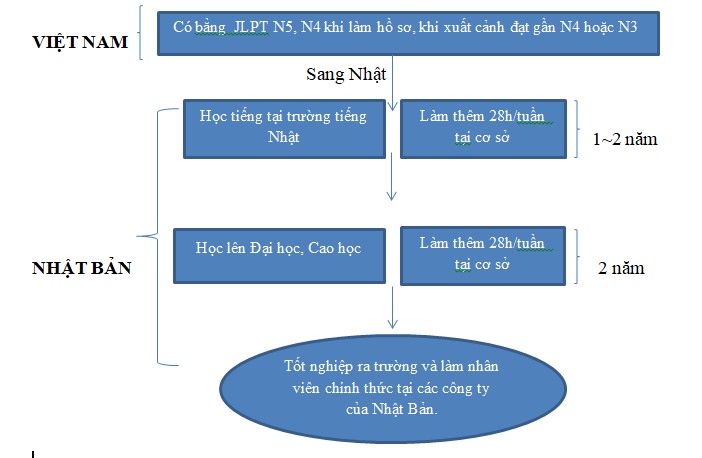 – Ứng viên sang Nhật học 01~02 năm tại trường đào tạo tiếng Nhật đạt trình độ tiếng Nhật N2, sau đó học lên Đại học, Cao học theo mong muốn của bản thân. Sau khi tốt nghiệp học viên có thể làm việc tại các công ty, doanh nghiệp của Nhật Bản.